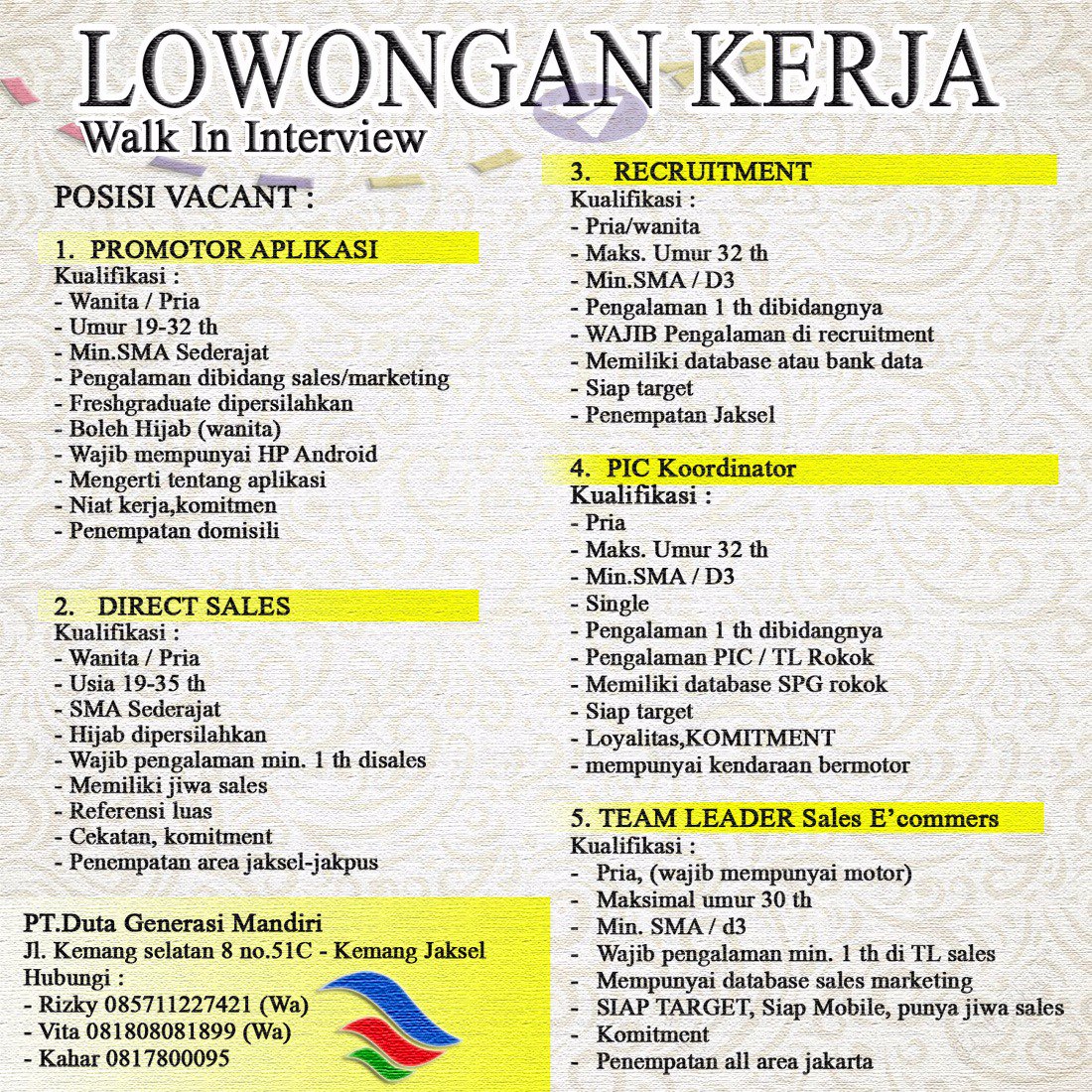 Penampilan menarik Pendidikan min SMASederajat Berkomunikasi dengan baik Bisa kerja team Suka tantangan Penempatan standbooth Benefit. Lowongan Kerja SPG Event. Indo Elang Kreasi terbaru untuk wilayah Jakarta.